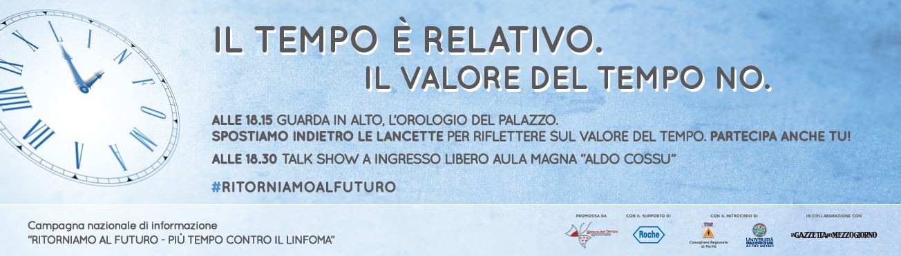 Il valore del tempo. “Il tempo è forse oggi l’unica forma di democrazia assoluta -commenta Serafina Gelao, Presidente Coordinamento Banche del Tempo di Bari -poiché è uguale per tutti. Eppure un quarto della popolazione in Puglia dice di non avere mai tempo e di volerne di più per sé. Proprio dalla consapevolezza del valore del tempo è nata la Banca del Tempo: un istituto di credito particolare dove i correntisti si scambiano attività pagando con la moneta-tempo. È importante promuovere iniziative come la campagna di informazione ‘Ritorniamo al Futuro’, che vuole sensibilizzare gli italiani sul linfoma non-Hodgkin e su come il tempo influisca direttamente sulla qualità di vita delle persone, ancora di più per i pazienti”.